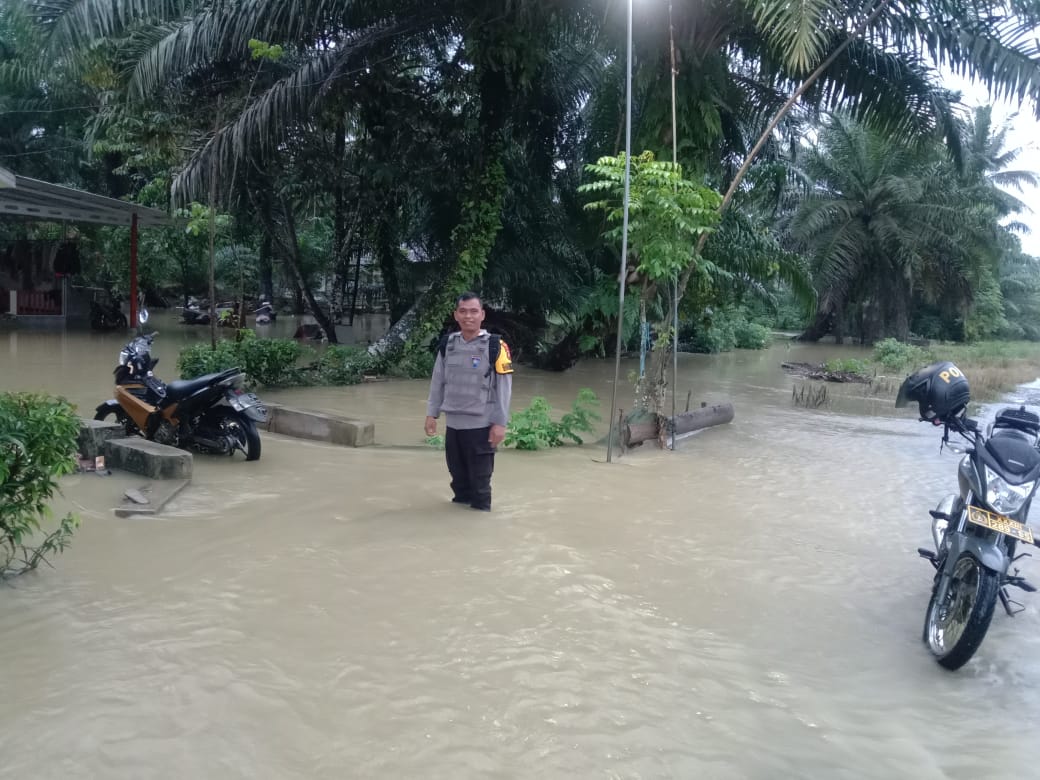Bhabinkamtibmas Polsek Sarudu Briipka Felix menyambangi warganya yang terkena banjir guna memberikan himbauan kamtibmas agar berhati – hati.