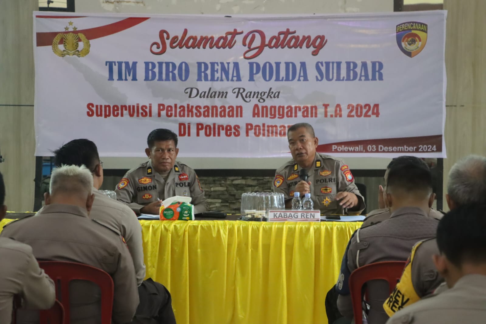 Tim Biro Rena Polda Sulbar yang dipimpin oleh Ketua Tim Iptu Gimon beserta Tim, diterima langsung oleh Kapolres Polman, AKBP Anjar Purwoko yang diwakili oleh Kabag Ren Polres Polman Akp Tjatur, beserta pejabat utama Polres Polman beserta Kapolsek jajaran Polres Polman dan operator.
