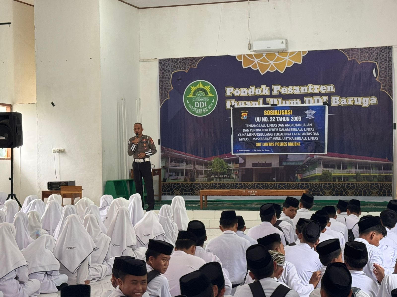 Polres Majene – Satuan Lalu Lintas (Satlantas) Polres Majene mengadakan kegiatan sosialisasi dan edukasi mengenai Undang-Undang No. 22 Tahun 2009 tentang Lalu Lintas dan Angkutan Jalan (LLAJ) kepada para santri Pondok Pesantren Ihyaul Ulum DDI Baruga. Senin (20/1/25)