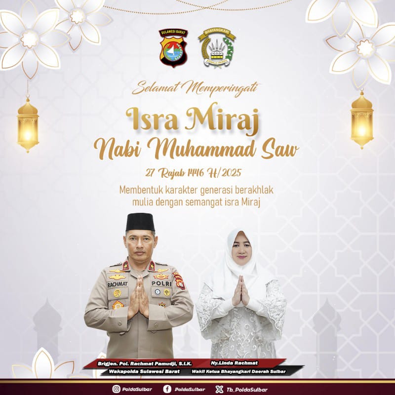 Melalui pesan yang disampaikan oleh Wakapolda Sulawesi Barat, Brigjen. Pol. Rachmat Pamudji, S.I.K., bersama Wakil Ketua Bhayangkari Daerah Sulbar, Ny. Linda Rachmat, Polda Sulbar mengajak seluruh elemen masyarakat untuk menjadikan semangat Isra Miraj sebagai inspirasi dalam kehidupan sehari-hari. Semangat ini diharapkan dapat menjadi fondasi dalam membangun generasi yang berintegritas, beriman, dan menjunjung tinggi nilai-nilai moral.
