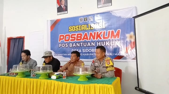 Sidorejo, Wonomulyo – Bhabinkamtibmas Desa Sidorejo Polsek Wonomulyo, Aiptu Suranto, menghadiri kegiatan sosialisasi Pos Bantuan Hukum (Posbankum) yang dilaksanakan di Aula Kantor Desa Sidorejo Kecamatan Wonomulyo Kabupaten Polman. Selasa (08/07/25).