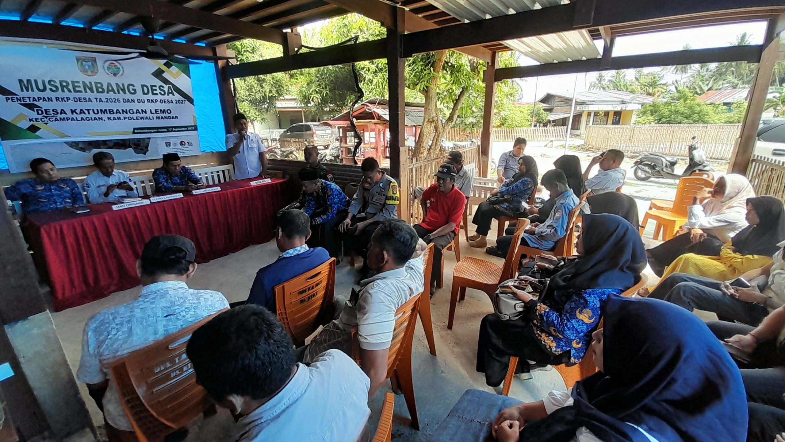 POLMAN – Bhabinkamtibmas Desa Katumbangan Lemo Polsek Campalagian Polres Polman, Bripka Nasyaruddin, menghadiri sekaligus melakukan monitoring jalannya Musyawarah Perencanaan Pembangunan (Musrenbang) Desa Katumbangan Lemo Tahun Anggaran 2026. Kegiatan yang juga membahas Rencana Kerja Pemerintah Desa (RKPDes) Tahun 2027 tersebut berlangsung di Aula Kantor Desa Katumbangan Lemo, Kecamatan Campalagian, Kabupaten Polewali Mandar, Rabu (17/09/25).