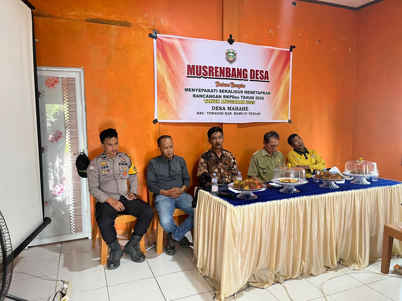 Polres Mamuju Tengah – Bhabinkamtibmas Desa Mahahe, Bripda Igo, menghadiri kegiatan Musyawarah Perencanaan Pembangunan Desa dalam rangka penyekapan sekaligus penetapan rancangan Rencana Kerja Pemerintah Desa (RKPDes) Tahun 2026. Kegiatan ini berlangsung di Aula Kantor Desa Mahahe, Kecamatan Tobadak, Kabupaten Mamuju Tengah, Rabu (01/10/2024).