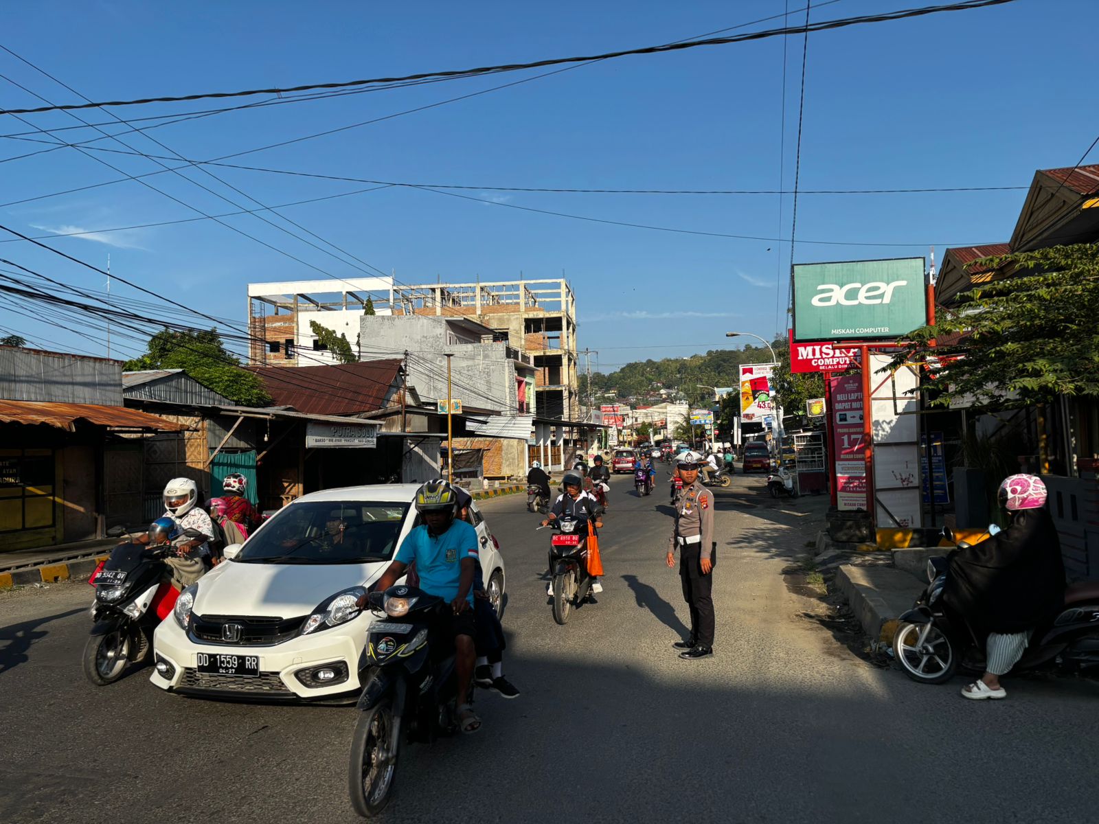Dalam kegiatan ini, personel Sat Lantas hadir langsung di lapangan untuk memberikan pelayanan kepada masyarakat dan pengguna jalan. Mereka memastikan arus lalu lintas berjalan aman, lancar, serta mengantisipasi potensi kemacetan di jam sibuk masyarakat beraktivitas.