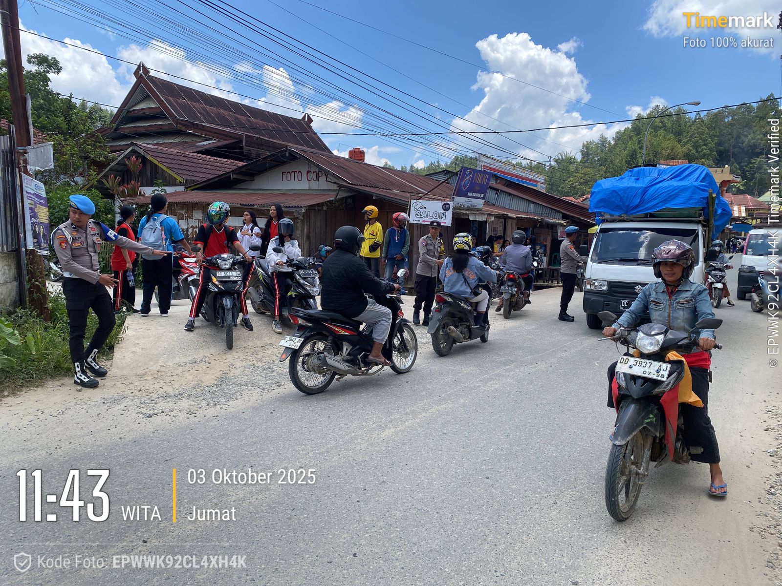 Lokasi pengaturan difokuskan di depan SMP Negeri 1 Mamasa, depan Polsek Mamasa, serta di pertigaan SMA Negeri 1 Mamasa. Kegiatan ini dipimpin langsung oleh personel piket Regu II Polsek Mamasa yang sigap mengatur arus kendaraan agar tetap tertib dan aman.