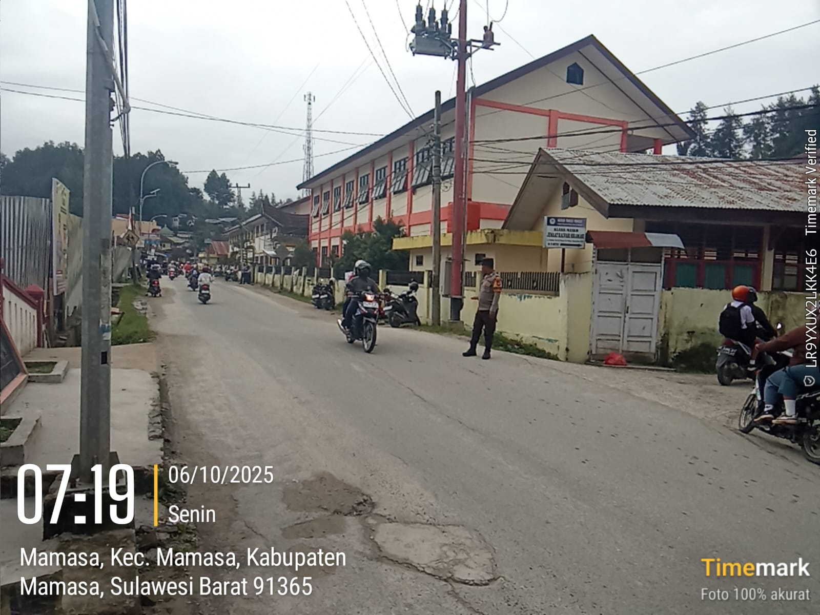 Kegiatan ini dipimpin oleh personel piket Regu I Polsek Mamasa, dengan lokasi pelaksanaan di tiga titik strategis, yaitu di pintu masuk SMP Negeri 1 Mamasa, depan Polsek Mamasa, dan pertigaan SMA Negeri 1 Mamasa.