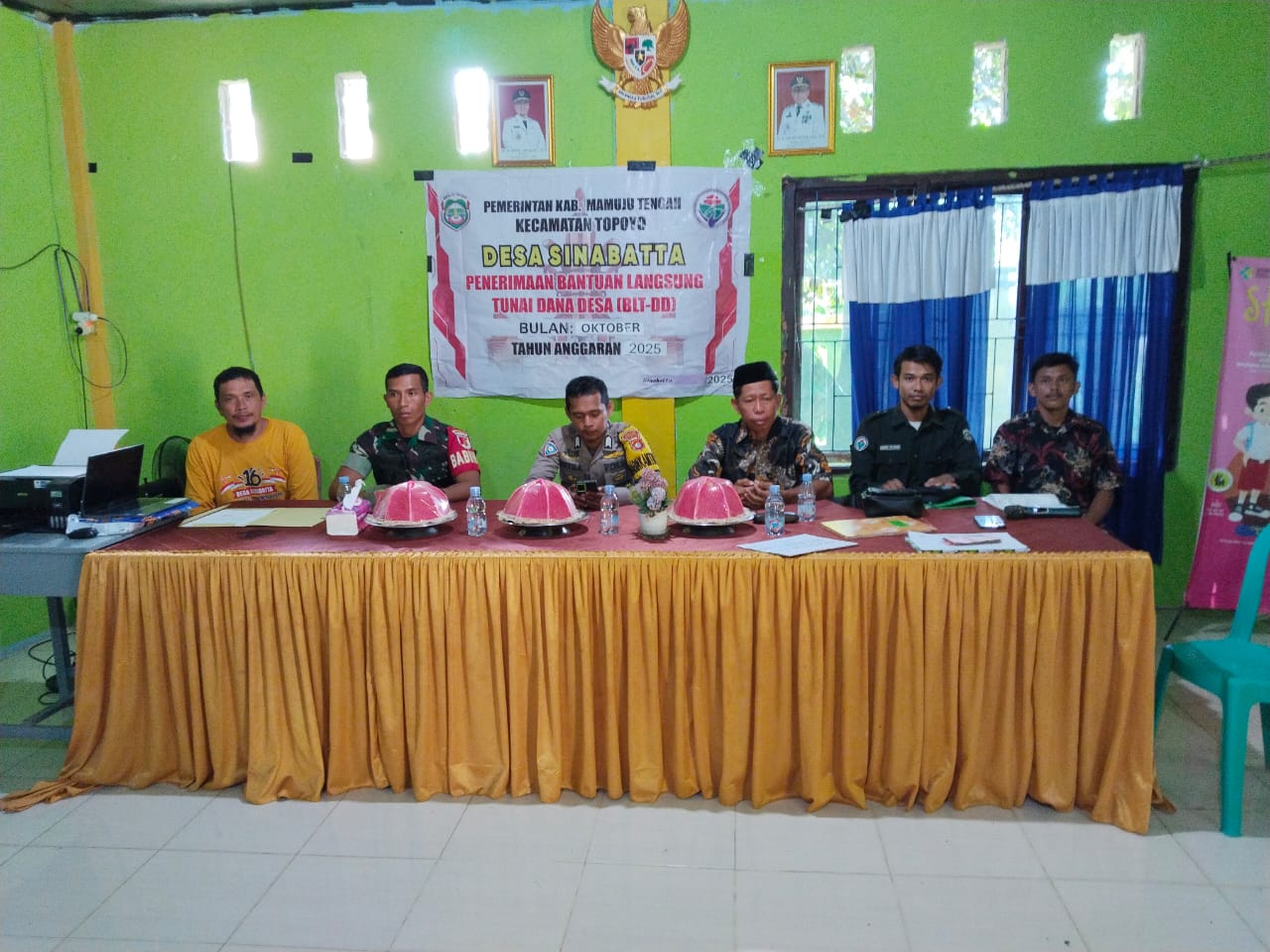 Polres Mamuju Tengah – Sebagai wujud dukungan terhadap program pemerintah dalam penyaluran bantuan sosial kepada masyarakat, Bhabinkamtibmas Desa Sinabatta, Polsek Tobadak, Polres Mamuju Tengah, Bripka Mitra Palute, menghadiri kegiatan Penyaluran Bantuan Langsung Tunai Dana Desa (BLT-DD) Tahun 2025 yang dilaksanakan di Kantor Desa Sinabatta, Kecamatan Tobadak, Kabupaten Mamuju Tengah, Kamis (7/10/2025).
