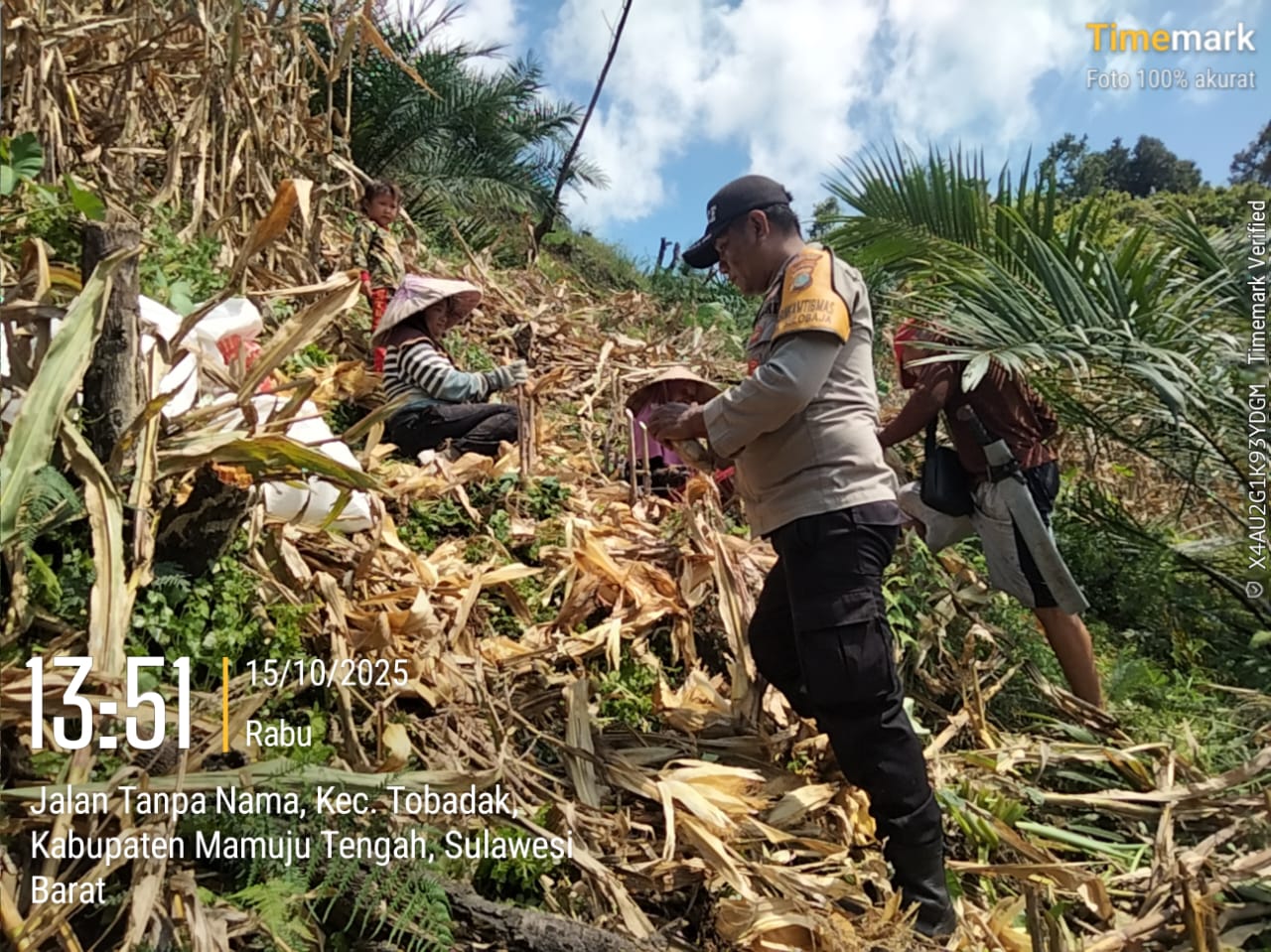 Polres Mamuju Tengah – Bhabinkamtibmas Desa Sulobaja, Kecamatan Tobadak, Kabupaten Mamuju Tengah, Brigpol Rajamang, melaksanakan kegiatan monitoring panen jagung di lahan produktif milik masyarakat Dusun Sungguminasa, Kamis (16/10/2025).