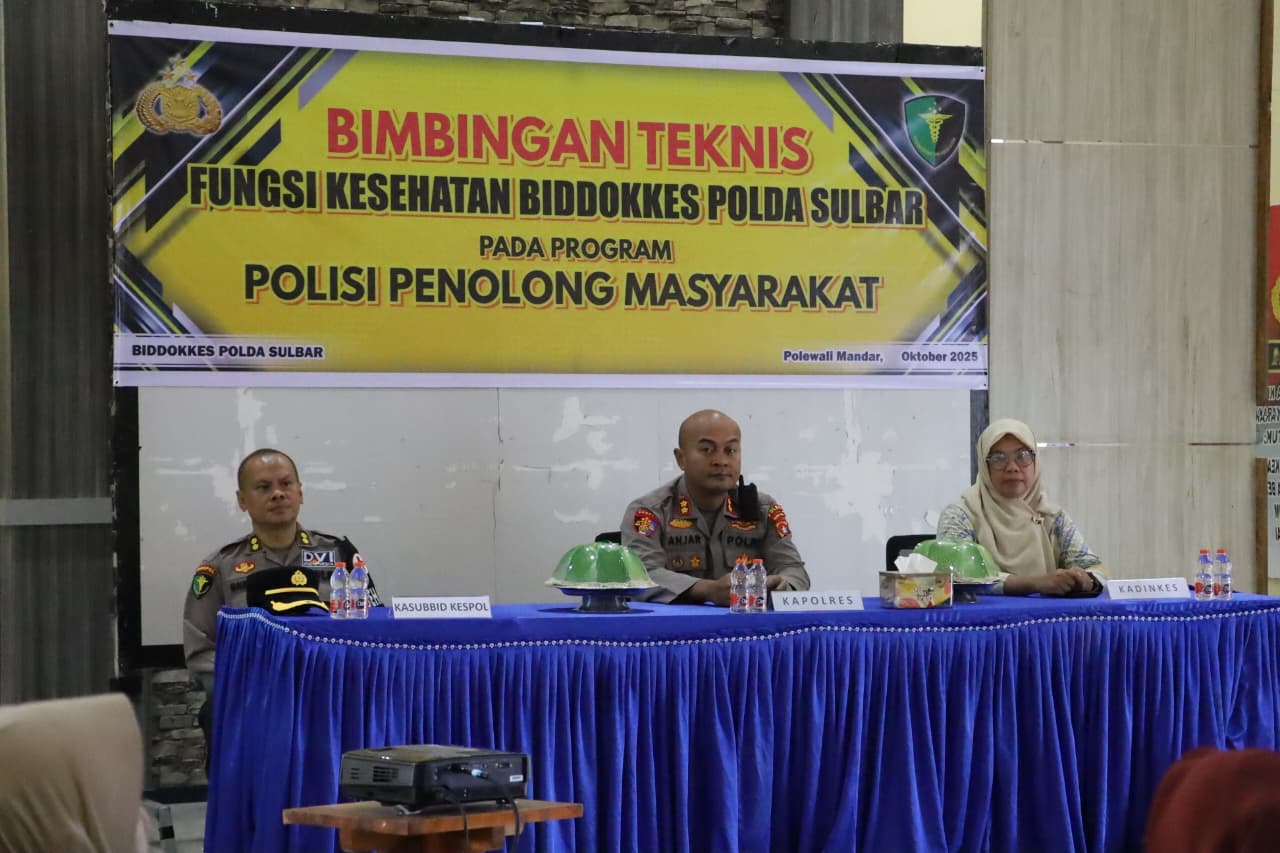 POLRES POLMAN — Kapolres Polewali Mandar (Polman) AKBP Anjar Purwoko, SH., S.I.K. menerima kunjungan Tim Bimbingan Teknis (Bimtek) Fungsi Kesehatan Bidang Kedokteran dan Kesehatan (Bidokkes) Polda Sulawesi Barat, yang dipimpin oleh Kasubbid Kespol Bidokkes Polda Sulbar, AKBP Dr. dr. Mauluddin M., S.Sos., MH., Sp.F.