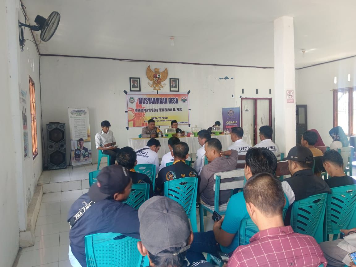 Polres Mamuju Tengah – Bhabinkamtibmas Desa Topoyo Briptu Alamsyah Alim menghadiri kegiatan Musyawarah Desa (Musdes) di Kantor Desa Topoyo, Kecamatan Topoyo, dalam rangka Penetapan APBDes Perubahan Tahun Anggaran 2025 serta Musyawarah Perencanaan Pembangunan Desa (Musrenbangdes) tentang Penyusunan Rencana Kerja Pemerintah Desa (RKPDes) Tahun 2025, pada Rabu (22/10/2025).
