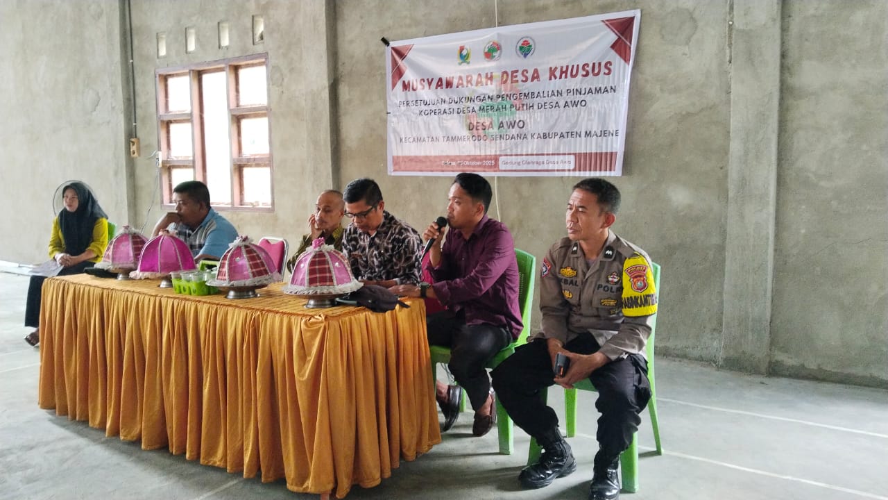 Polres Majene – Dalam upaya menjaga sinergitas antara pihak kepolisian dan pemerintahan desa, Bhabinkamtibmas Polsek Sendana Aipda Ikbal menghadiri kegiatan Rapat Musyawarah Desa (Musdes) Khusus terkait persetujuan dukungan pengembalian pinjaman Koperasi Desa (Kopdes) Merah Putih, yang digelar di Aula Kantor Desa Awo, Kecamatan Tammerodo Sendana, Kabupaten Majene, Kamis (30/10/25).