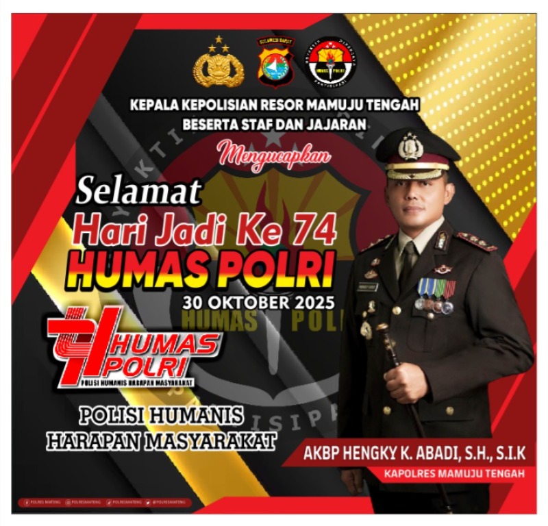“Selamat Hari Jadi ke-74 untuk seluruh insan Humas Polri, khususnya Humas Polres Mamuju Tengah. Teruslah menjadi garda terdepan dalam menyampaikan informasi yang akurat, membangun kepercayaan publik, dan memperkuat kemitraan antara Polri dan masyarakat,” ujar Kapolres Mamuju Tengah.