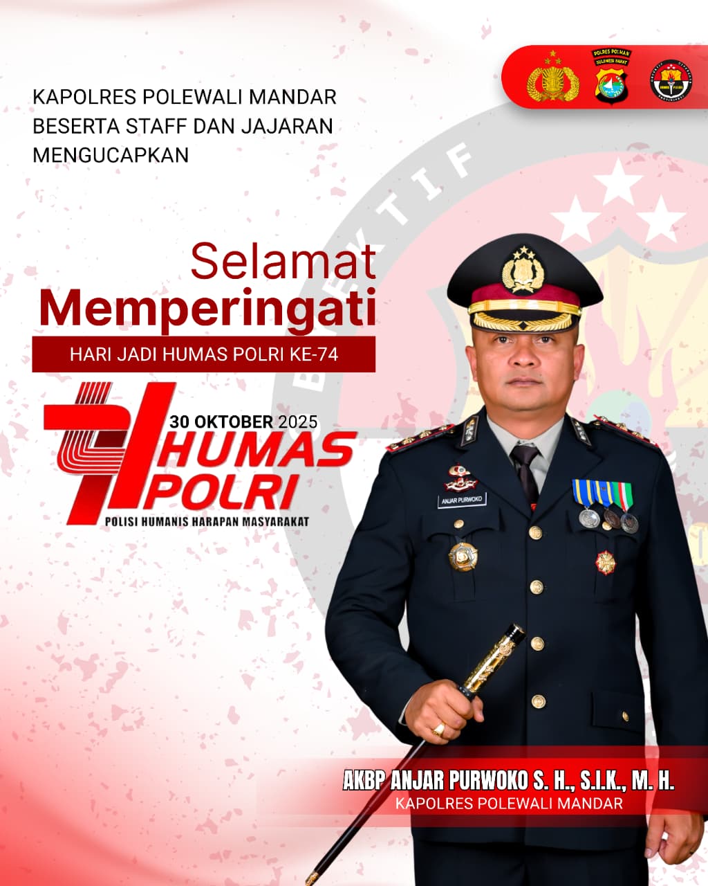POLRES POLMAN – Dalam momentum Hari Jadi Humas Polri ke-74 yang diperingati pada 30 Oktober 2025, Kapolres Polewali Mandar (Polman) AKBP Anjar Purwoko, S.H., S.I.K., M.H. menyampaikan ucapan selamat sekaligus apresiasi mendalam kepada seluruh insan Humas Polri, khususnya jajaran Humas Polres Polman yang terus berperan aktif sebagai jembatan komunikasi antara Polri dan masyarakat.