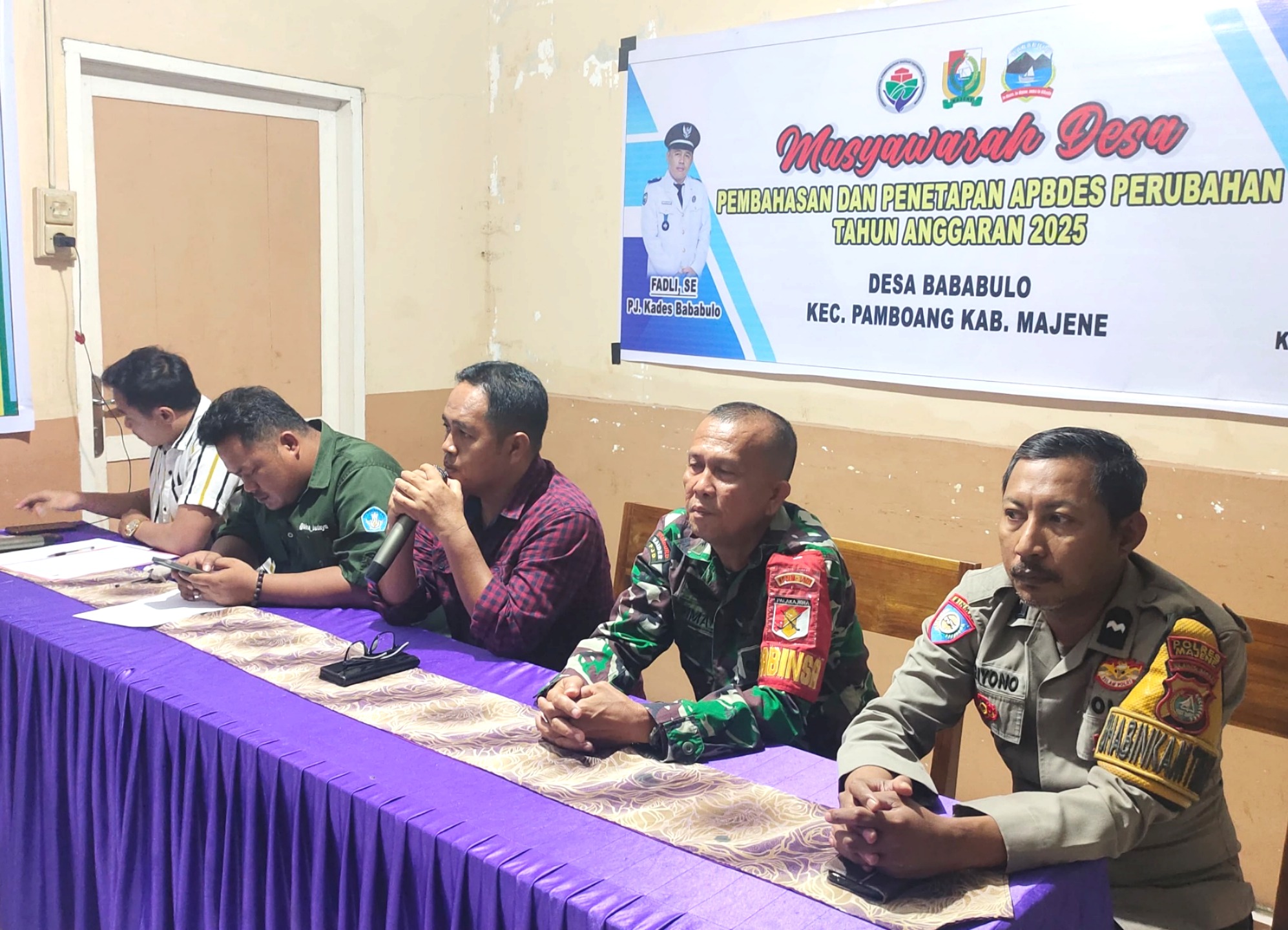Polres Majene – Dalam rangka mendukung terciptanya tata kelola pemerintahan desa yang transparan dan partisipatif, Bhabinkamtibmas Polsek Pamboang Aipda Heriyono, S.Pd hadiri kegiatan Musyawarah Desa Pembahasan dan Penetapan APBDes Perubahan Tahun Anggaran 2025 yang digelar di Kantor Desa Bababulo, Dusun Bababulo, Kecamatan Pamboang, Kabupaten Majene, Minggu malam (2/11/2025).