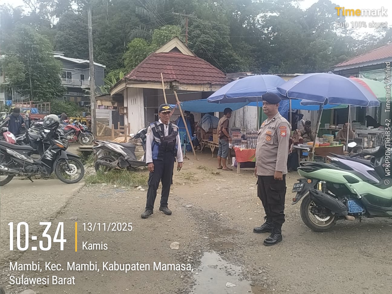 POLRES MAMASA–Personel Polsek Mambi melaksanakan kegiatan pengamanan (PAM) dan pengaturan arus lalu lintas di sekitar Pasar Mambi, Kecamatan Mambi, Kabupaten Mamasa, pada Kamis pagi, 13 November 2025