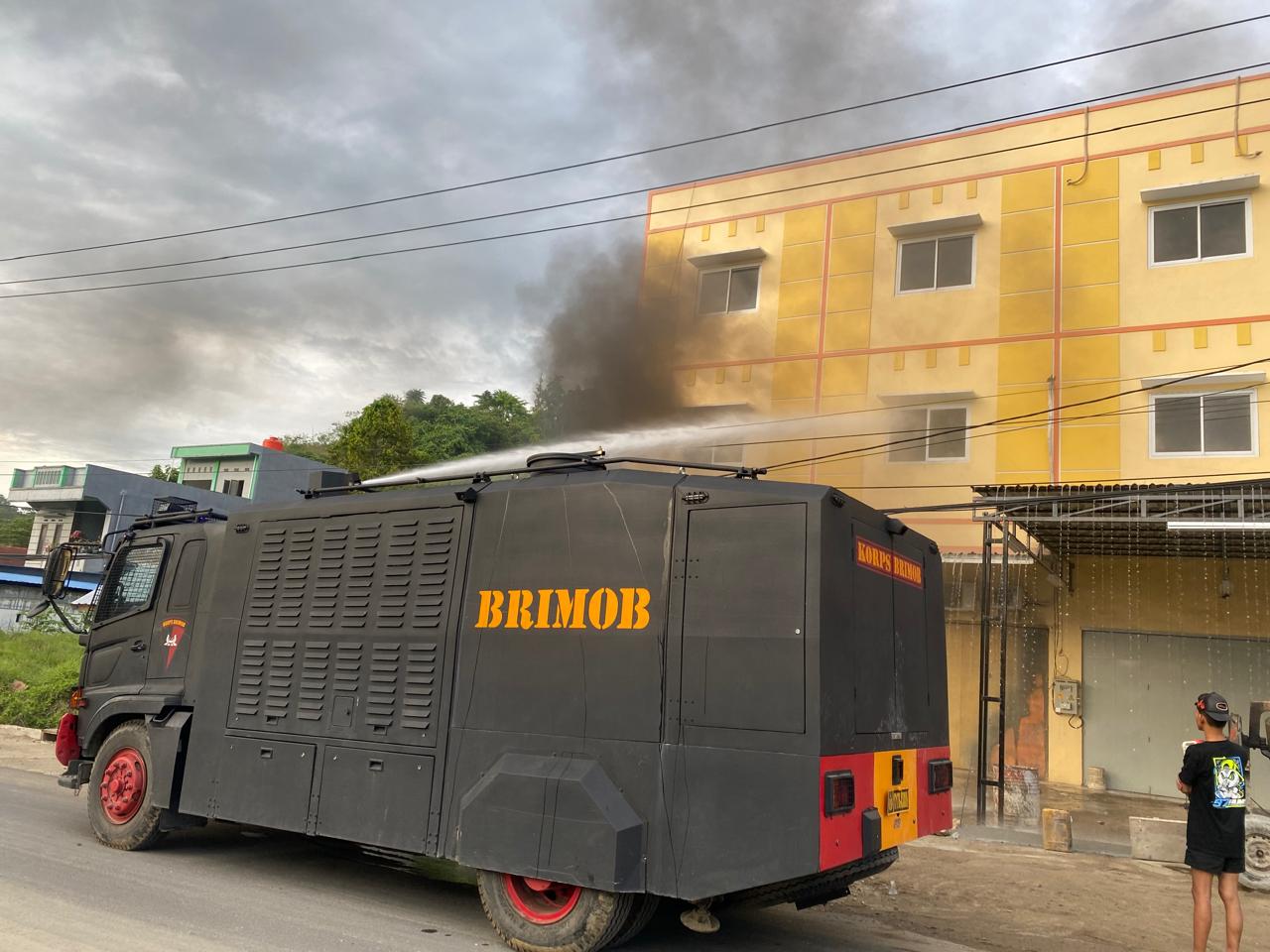 Watercanon Brimob Polda Sulbar Bergerak Cepat Padamkan Kebakaran Ruko di Mamuju