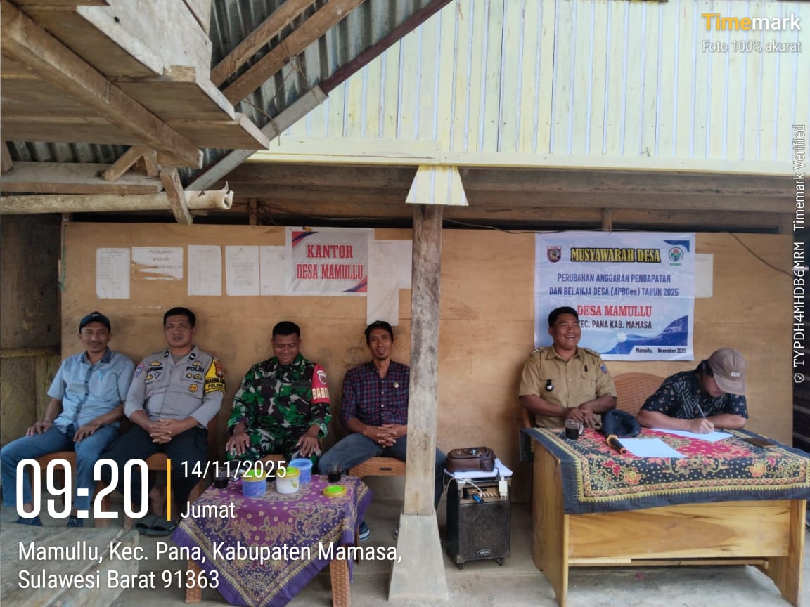 POLRES MAMASA–Bhabinkamtibmas Polsek Pana, Aipda Alexander, menghadiri kegiatan Musyawarah Pembangunan Desa (Musdes) Tahun 2025/2026 yang digelar di Kantor Desa Mamullu, Kecamatan Pana, Kabupaten Mamasa, pada Jumat pukul 08.30 WITA, 14 November 2025