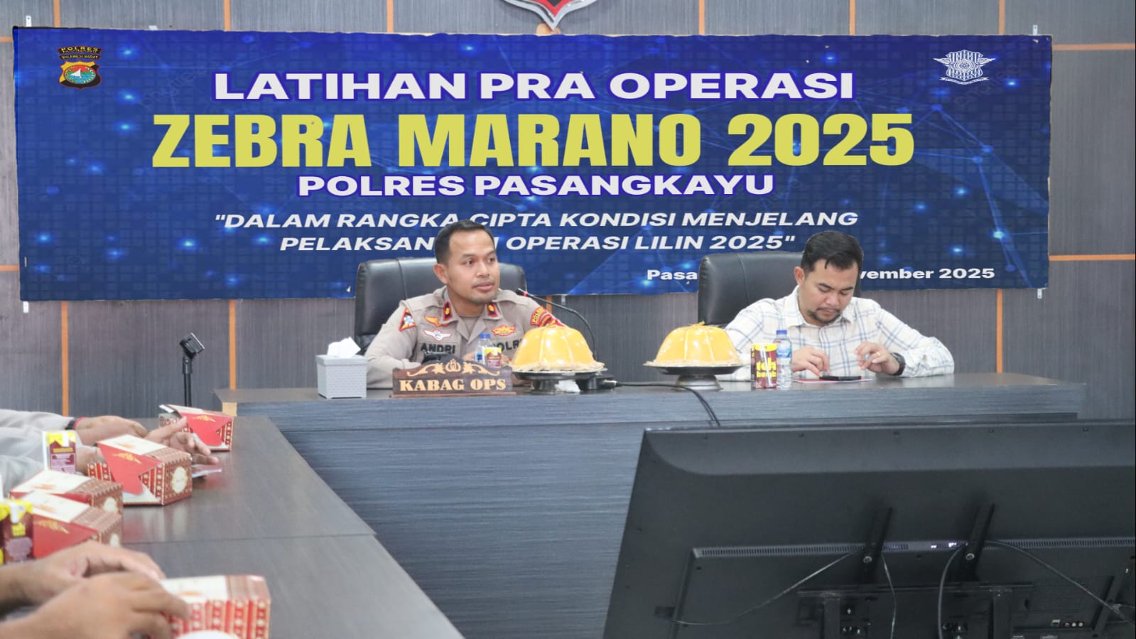 Polres Pasangkayu – Polres Pasangkayu menggelar Latihan Pra Operasi (Latpraops) Zebra Marano 2025 pada Jumat, 14 November 2025, pukul 14.00 Wita, bertempat di Aula Rupatama Polres Pasangkayu. Kegiatan dipimpin oleh Kabag Ops Polres Pasangkayu, Kompol Andri Aryansyah, S.I.K., didampingi Kasat Intelkam AKP Rio Acta Setyawan, S.Tr.K, S.I.K.