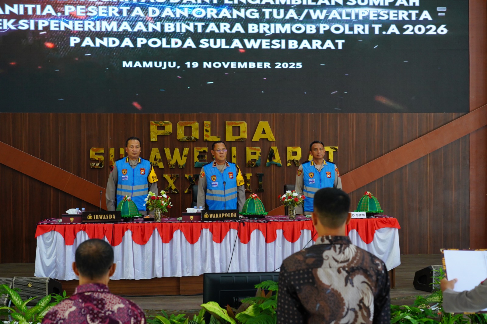 MAMUJU – Komitmen mewujudkan Polri yang Presisi kembali ditegaskan jajaran Polda Sulawesi Barat. Wakapolda Sulbar, Brigjen Pol Hari Santoso, memimpin langsung penandatanganan pakta integritas dan pengambilan sumpah bagi panitia, peserta, serta orang tua/wali pada Penerimaan Bintara Brimob Polri T.A. 2026, yang digelar di Aula Marannu Mapolda Sulbar, Rabu (19/11/25).