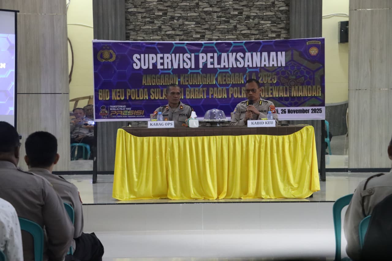 POLRES POLMAN — Kabag Ops Polres Polman Kompol Najamuddin menerima kunjungan Tim Supervisi Pelaksanaan Anggaran Keuangan Negara Tahun Anggaran 2025 dari Bidang Keuangan (Bid Keu) Polda Sulawesi Barat di Aula Rupatama Polres Polman, Rabu (26/11/25).