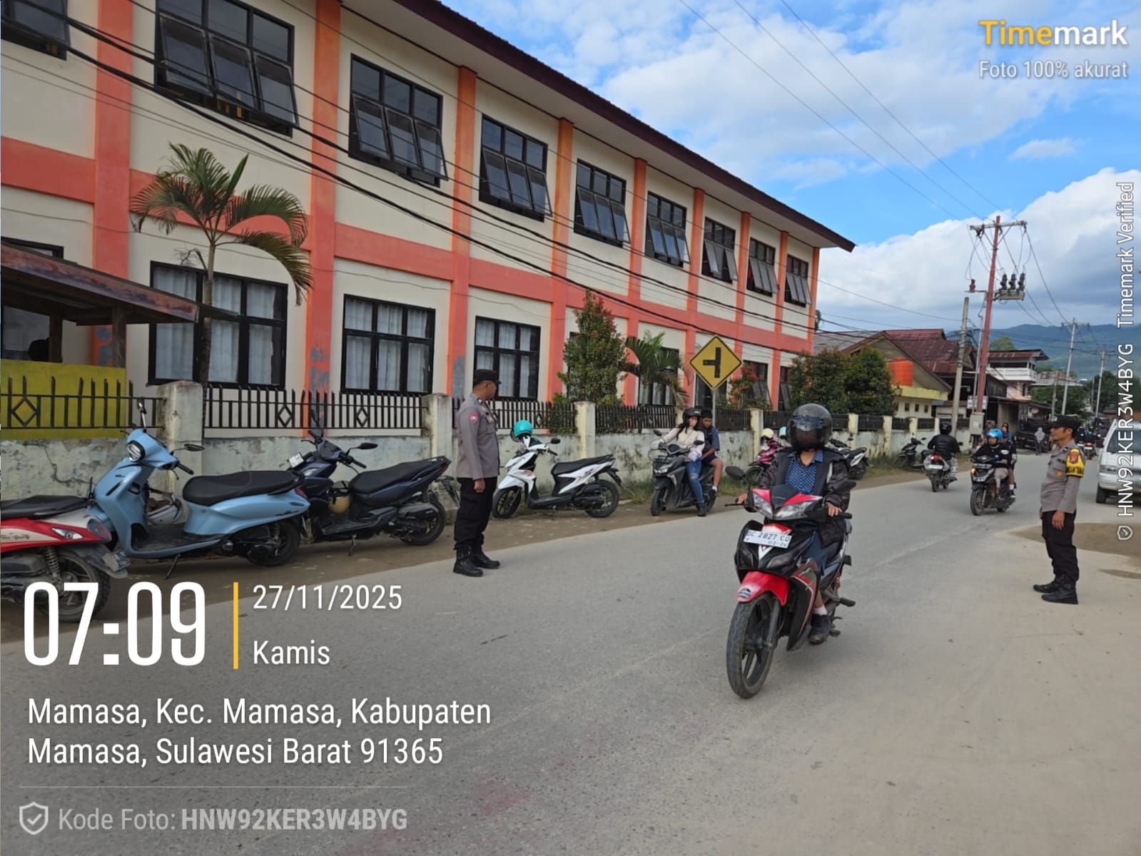 Kegiatan difokuskan pada dua titik yang dikenal rawan terjadi penumpukan kendaraan, yakni depan SMPN 1 Mamasa dan depan Mako Polsek Mamasa. Personel piket regu 3 diterjunkan langsung untuk melakukan pengaturan lalu lintas sekaligus memastikan masyarakat dapat beraktivitas dengan aman dan tertib.