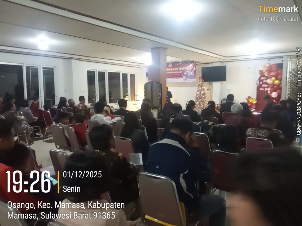 POLRES MAMASA–Ibadah Perayaan Natal Gereja KIBAID Mamasa berlangsung khidmat pada Senin, di Restoran Dian Satria, Jalan Poros Mamasa–Polewali, Desa Osango, Kecamatan Mamasa, Kabupaten Mamasa. Kegiatan dimulai sekitar pukul 18.00 WITA dan dihadiri kurang lebih 200 jemaat, 01 Desember 2025