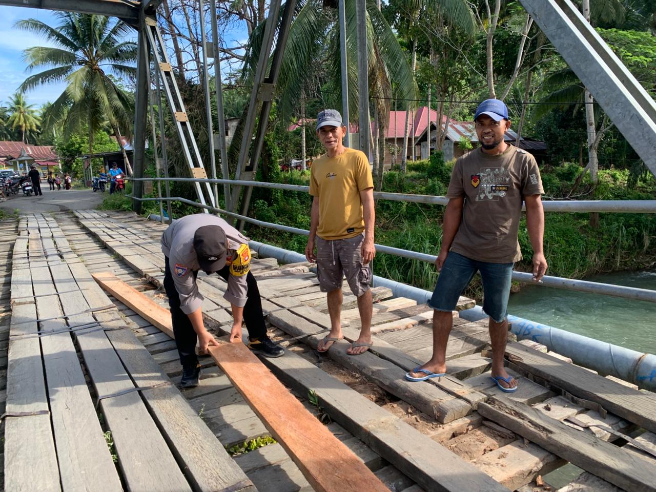 Jembatan yang diperbaiki merupakan akses vital yang setiap hari digunakan warga untuk beraktivitas. Kondisi kayu yang mulai lapuk dan membahayakan pengguna jalan membuat Bhabinkamtibmas bersama masyarakat turun tangan melakukan perbaikan. Dengan penuh semangat, warga dan polisi bekerja bersama memperkokoh kembali struktur jembatan agar aman dilalui.