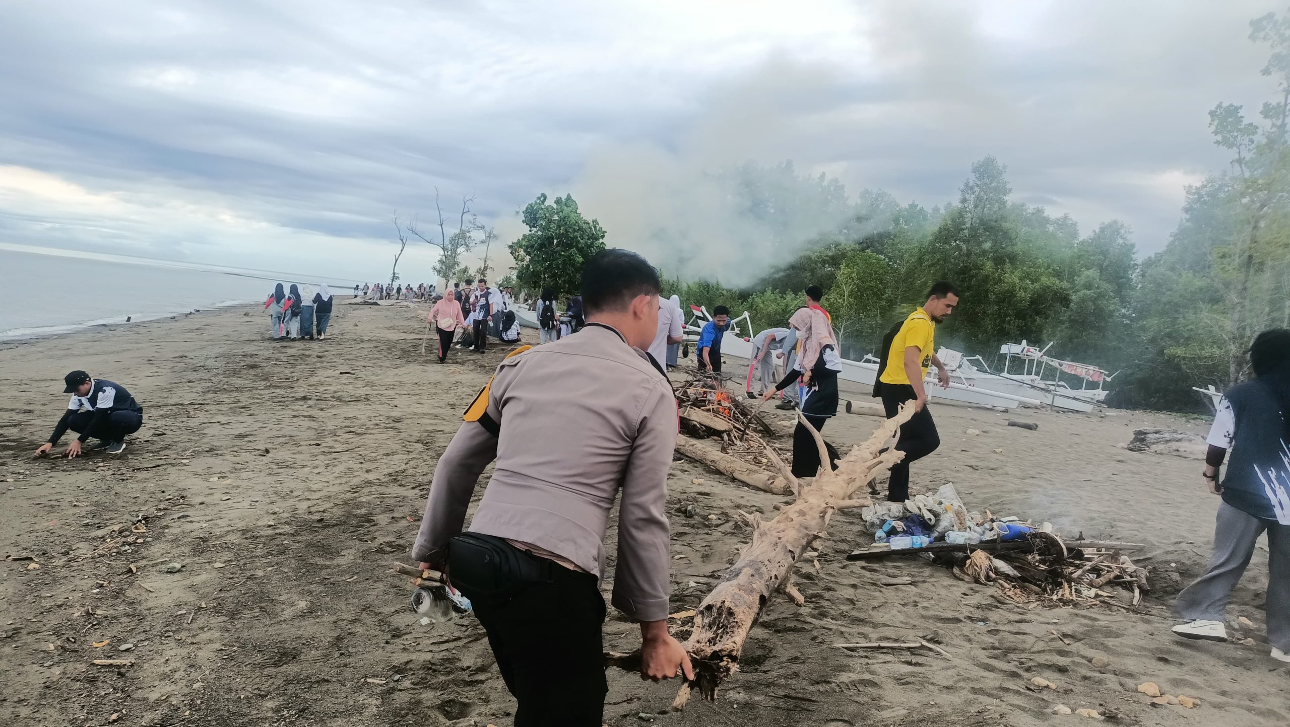 Dengan semangat gotong royong, para pelajar bersama AIPDA Hamdani memungut sampah yang berserak di bibir pantai—mulai dari plastik, ranting, hingga sampah rumah tangga. Setiap langkah kecil mereka menjadi wujud kepedulian besar terhadap alam, sekaligus pesan bahwa menjaga lingkungan adalah tanggung jawab bersama.