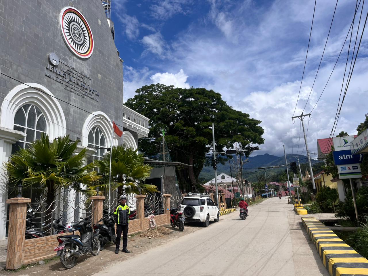 Personel Piket Sat Lantas Polres Mamasa, Briptu Rahmat Hidayat dan Bripda Steven, tampak aktif melakukan pemantauan arus kendaraan di sekitar gereja. Selain berjaga, petugas juga mengatur parkir kendaraan jemaat agar tertib dan tidak mengganggu pengguna jalan lainnya, terutama di ruas jalan yang rawan kepadatan.