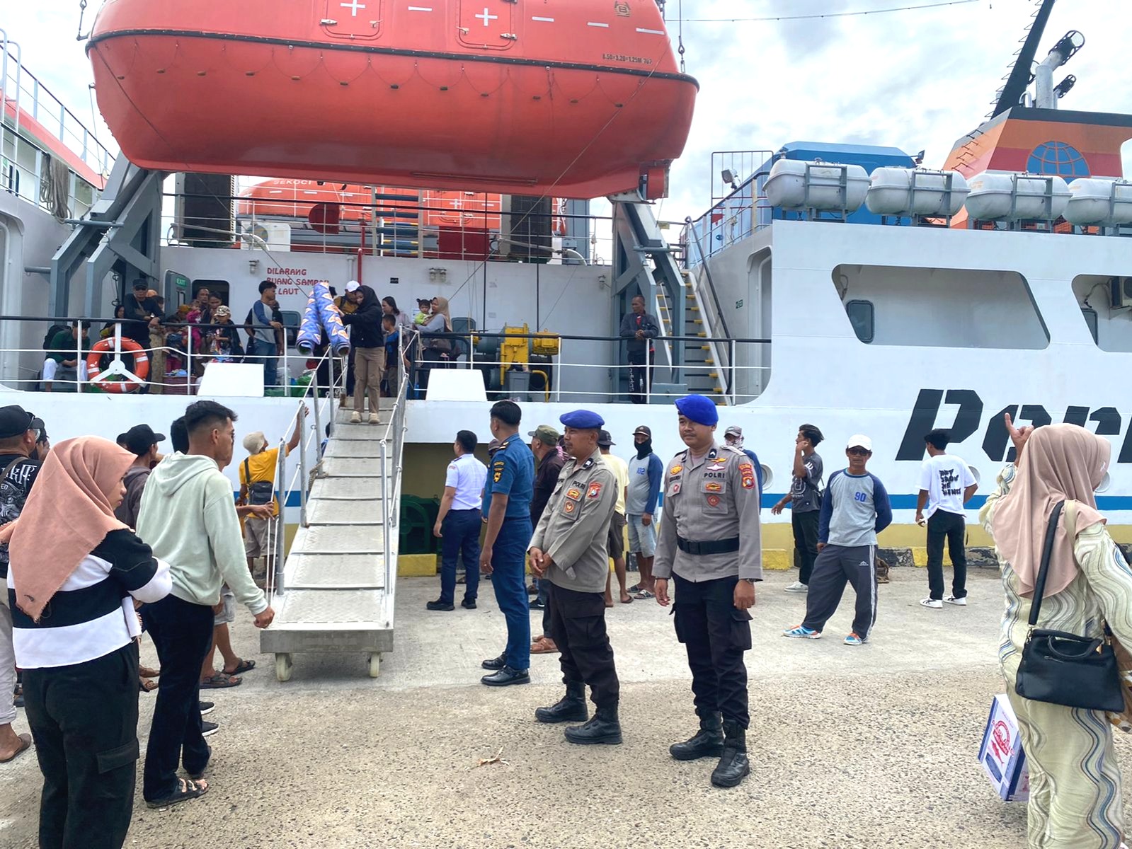 Sejak kapal bersandar, personel Sat Polair telah bersiaga di area dermaga untuk mengantisipasi potensi gangguan keamanan maupun kerawanan selama proses debarkasi dan embarkasi penumpang.