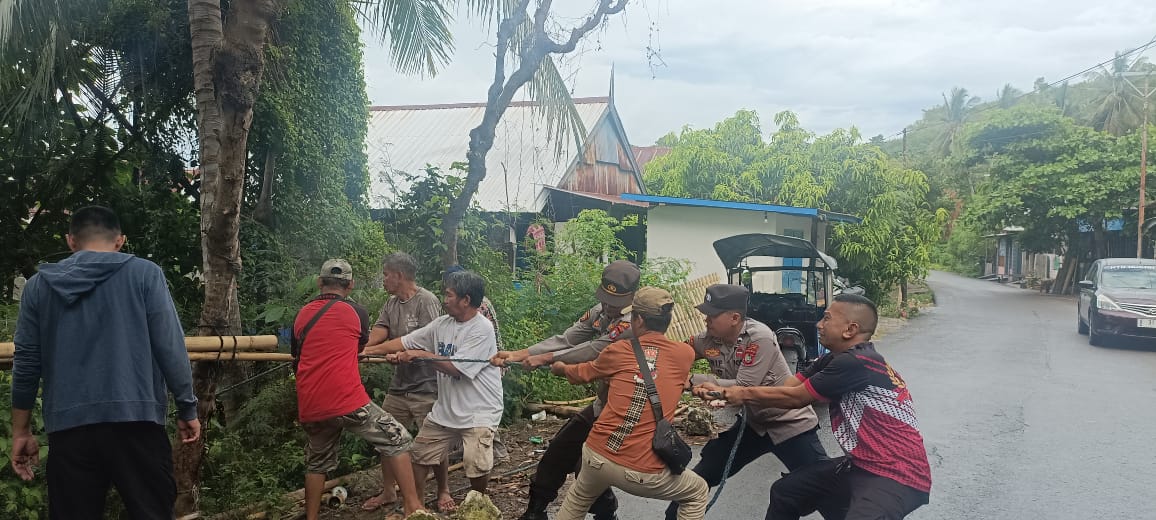 “Kami bersama personel TAGANA serta masyarakat setempat langsung melakukan gotong royong mengevakuasi pohon kelapa yang tumbang agar tidak membahayakan penghuni rumah maupun warga sekitar,” ujar IPDA Sumarlin di lokasi kejadian.