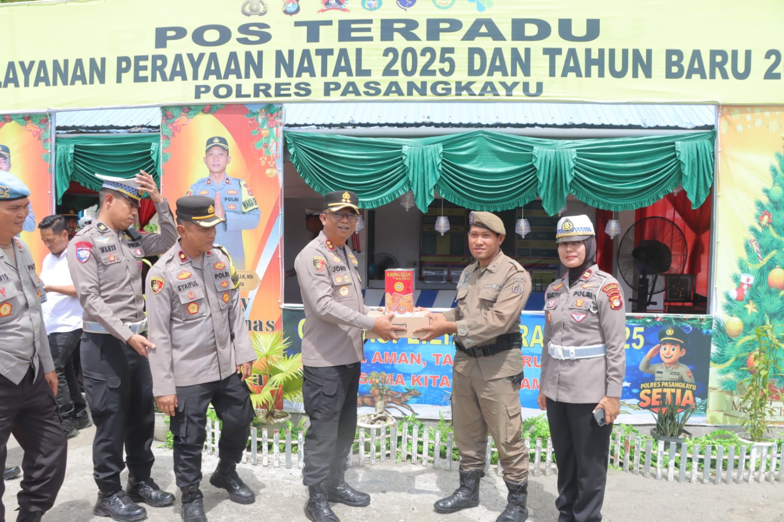 Tak sekadar melakukan pengawasan, Kapolres Pasangkayu juga menunjukkan kepedulian dengan menyerahkan bingkisan kepada personel yang bertugas di Pos Terpadu dan Pos Pengamanan. Bingkisan tersebut diberikan sebagai bentuk apresiasi atas dedikasi dan pengabdian anggota yang tetap siaga menjaga keamanan di tengah momen libur Natal dan Tahun Baru.