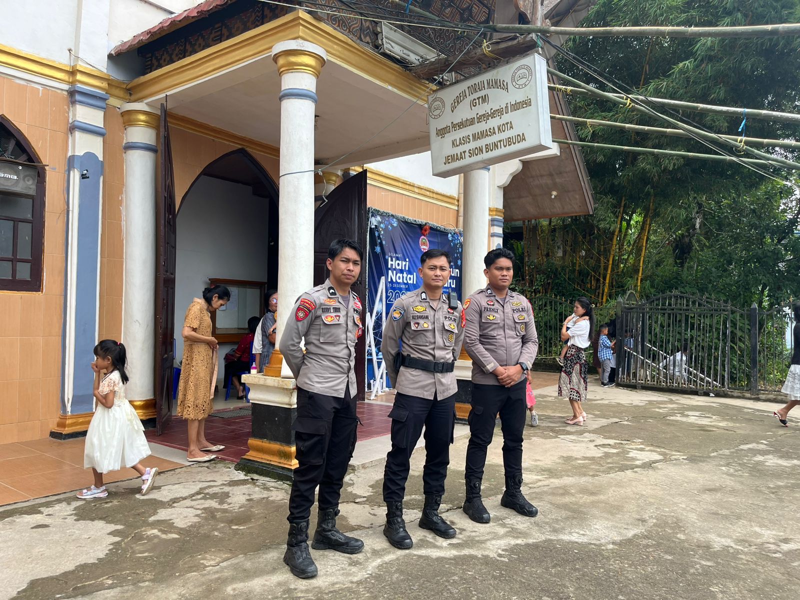 Untuk memastikan seluruh rangkaian ibadah berjalan lancar tanpa gangguan, Polri menurunkan personel pengamanan yang terdiri dari Brigpol Ali Jamal Saleh, Briptu Frenly, dan Bripda Rendy Three. Ketiganya disiagakan di sejumlah titik strategis, baik di area dalam maupun sekitar gereja, guna mengantisipasi potensi gangguan kamtibmas.