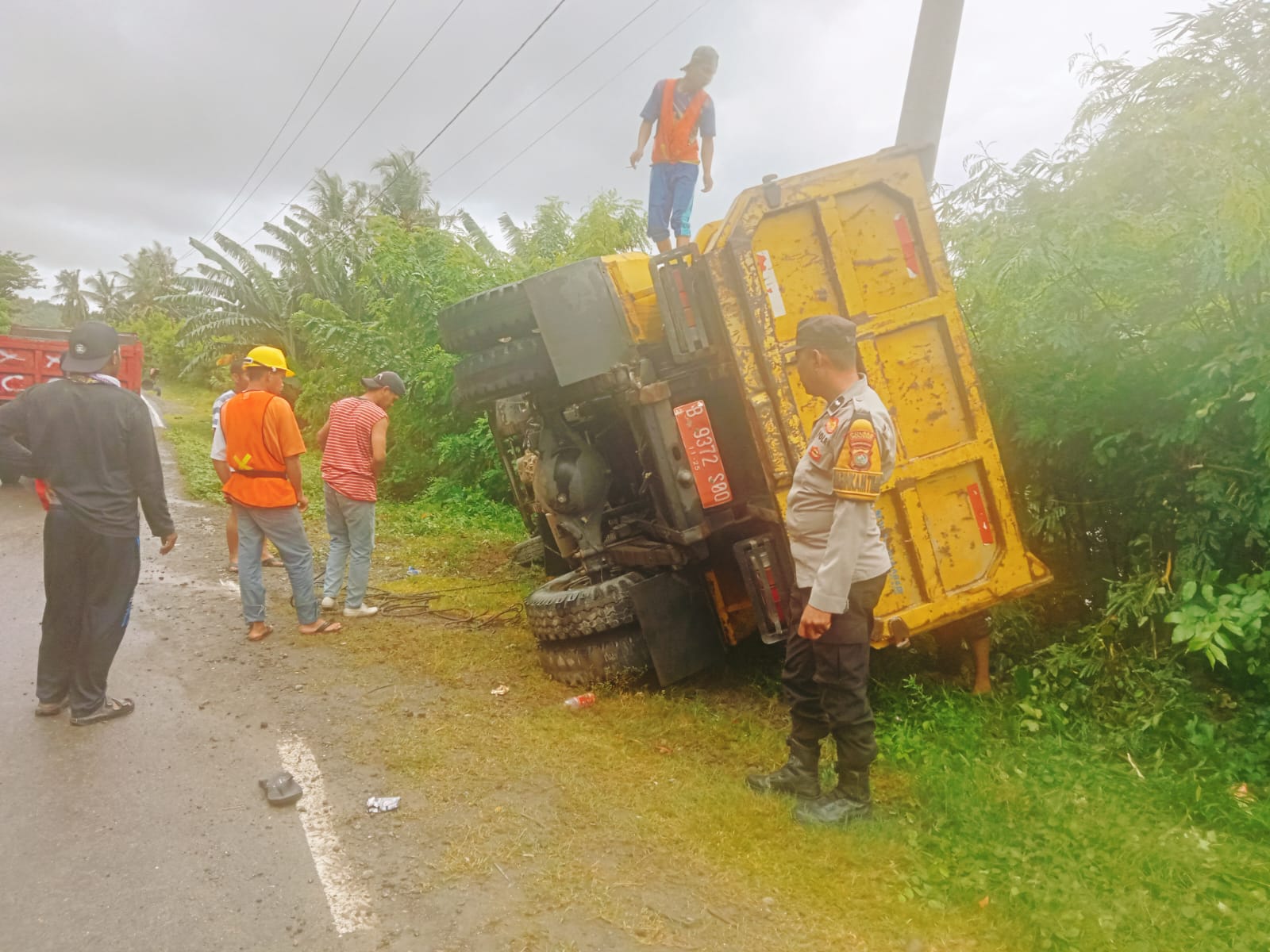 Dump Truck berwarna kuning dengan nomor polisi B 9372 SOQ tersebut dikemudikan oleh Jamaluddin (48). Kendaraan berat itu dilaporkan terbalik ke bawah badan jalan setelah kehilangan kendali saat melintas di lokasi kejadian. Beruntung, dalam peristiwa tersebut tidak terdapat korban jiwa.