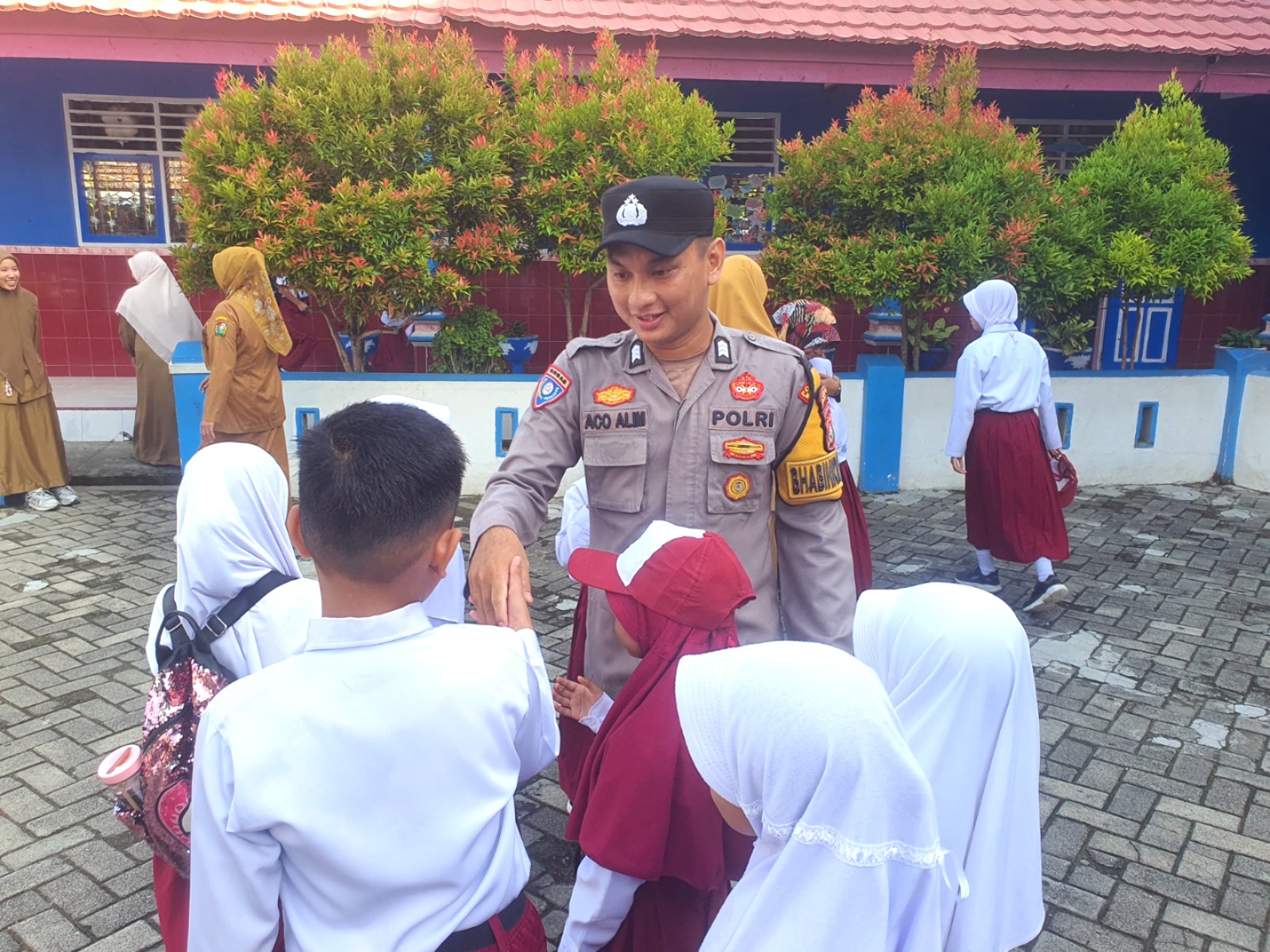 Polres Majene – Dalam rangka menanamkan kesadaran hukum sejak usia dini, Bhabinkamtibmas Polsek Banggae, Brigpol Aco Muhammad Nur Alim, S.H., melaksanakan kegiatan Polisi Go To School dengan menyambangi SDN 24 Saleppa yang berlokasi di Kelurahan Banggae, Kecamatan Banggae, Kabupaten Majene, pada Senin (5/1/26).