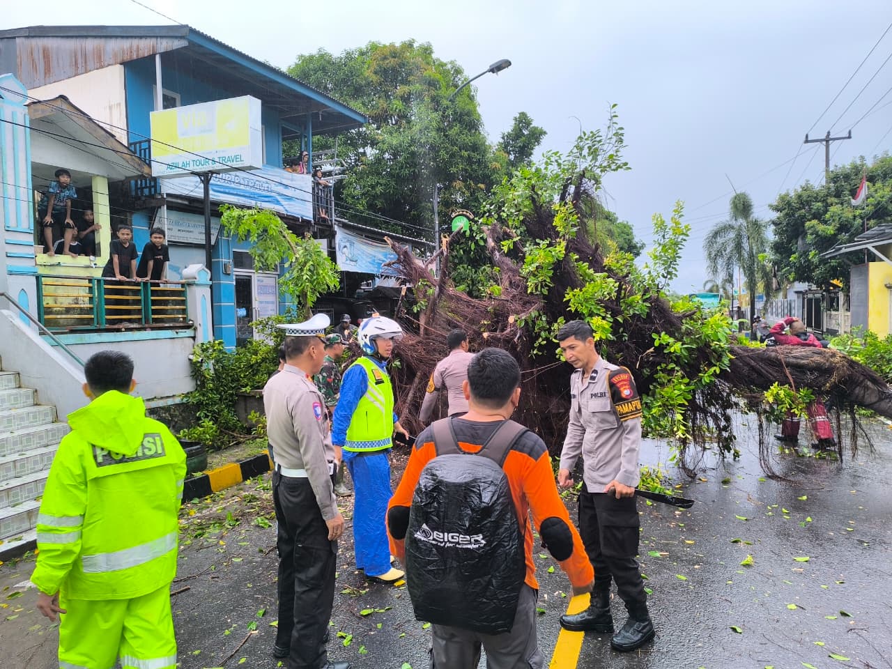 Polres Majene – Personel Polres Majene bergerak cepat melakukan evakuasi pohon tumbang yang menghalangi badan Jalan Trans Sulawesi, tepatnya di Jalan Jenderal Sudirman, Kelurahan Lembang, Kecamatan Banggae Timur, Kabupaten Majene, Selasa (6/1/2026).