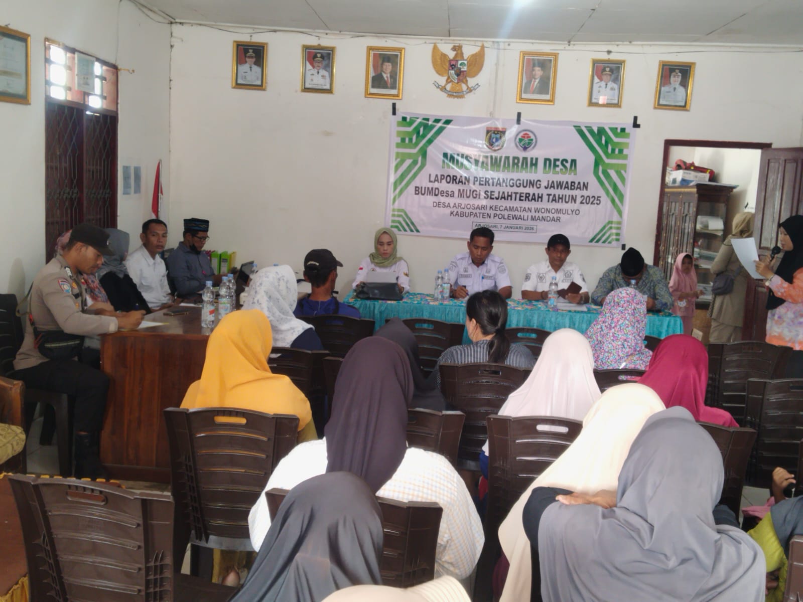 POLRES POLMAN — Komitmen menjaga transparansi dan akuntabilitas pengelolaan dana desa kembali ditegaskan. Bhabinkamtibmas Desa Arjosari, Polsek Urban Wonomulyo, Polres Polewali Mandar, menghadiri Musyawarah Desa dalam rangka Laporan Pertanggungjawaban (LPJ) Badan Usaha Milik Desa (BUMDes) Mugi Sejahtera Tahun Anggaran 2025, yang digelar di Kantor Desa Arjosari, Kecamatan Wonomulyo, Kabupaten Polewali Mandar, Rabu (7/1/2026).