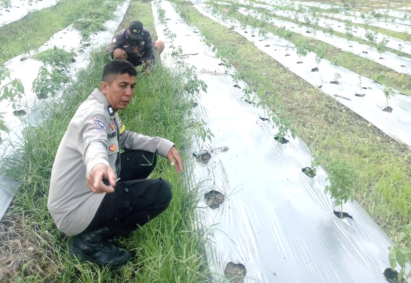 Dalam kunjungannya, AIPTU Hadis berdialog langsung dengan petani terkait kondisi tanaman cabai, kendala yang dihadapi di lapangan, serta upaya yang dapat dilakukan untuk meningkatkan produktivitas hasil panen.