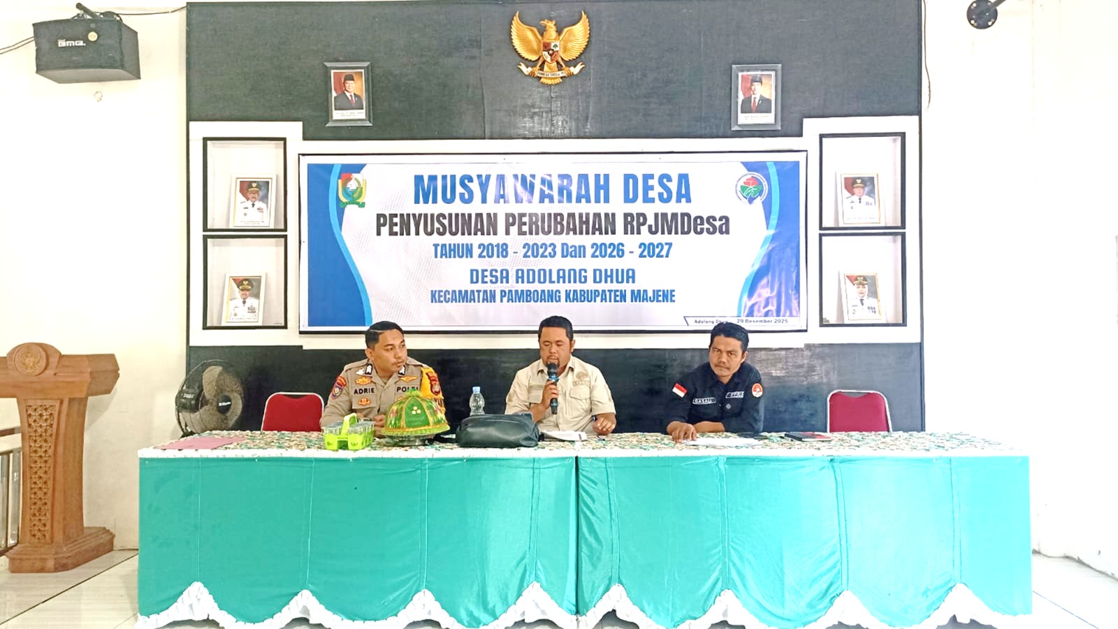 Polres Majene – Dalam rangka mendukung perencanaan pembangunan desa yang transparan dan partisipatif, Bhabinkamtibmas Polsek Pamboang Polres Majene, Brigpol Adri Cahyadi, S.H., menghadiri kegiatan Musyawarah Desa Penyusunan Perubahan Rencana Pembangunan Jangka Menengah Desa (RPJMDesa) Tahun 2027 yang digelar di Aula Kantor Desa Adolang Dhua, Kecamatan Pamboang, Kabupaten Majene, Selasa (3/2/26).
