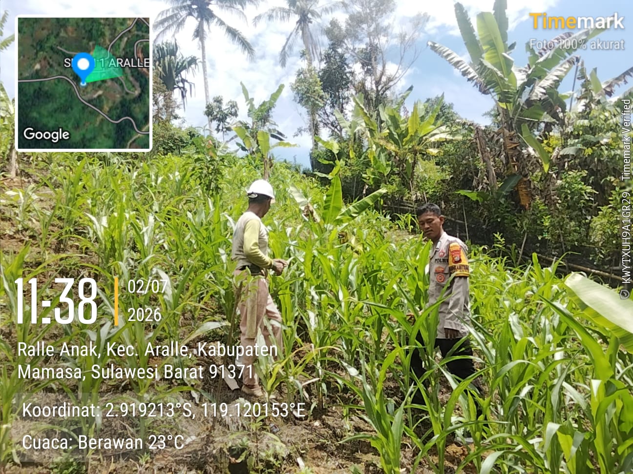 POLRES MAMASA – Komitmen Polri dalam mendukung ketahanan pangan nasional terus ditunjukkan hingga ke pelosok desa. Bhabinkamtibmas Polsek Aralle turun langsung melakukan monitoring lahan jagung milik warga di Dusun Salukero, Desa Uhaidao, Kecamatan Aralle, Kabupaten Mamasa, Sabtu (7/2/2026).