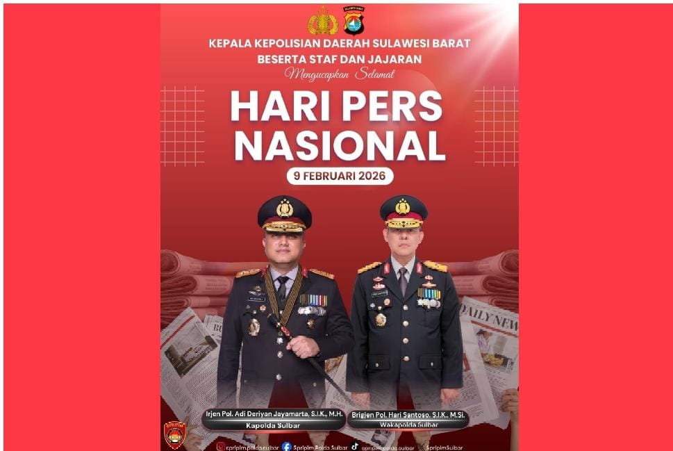 MAMUJU — Kepala Kepolisian Daerah Sulawesi Barat (Kapolda Sulbar) Irjen Pol. Adi Deriyan Jayamarta, S.I.K., M.H., bersama Wakapolda Sulbar Brigjen Pol. Hari Santoso, S.I.K., M.Si., menyampaikan ucapan Selamat Hari Pers Nasional (HPN) 2026 yang diperingati setiap tanggal 9 Februari.