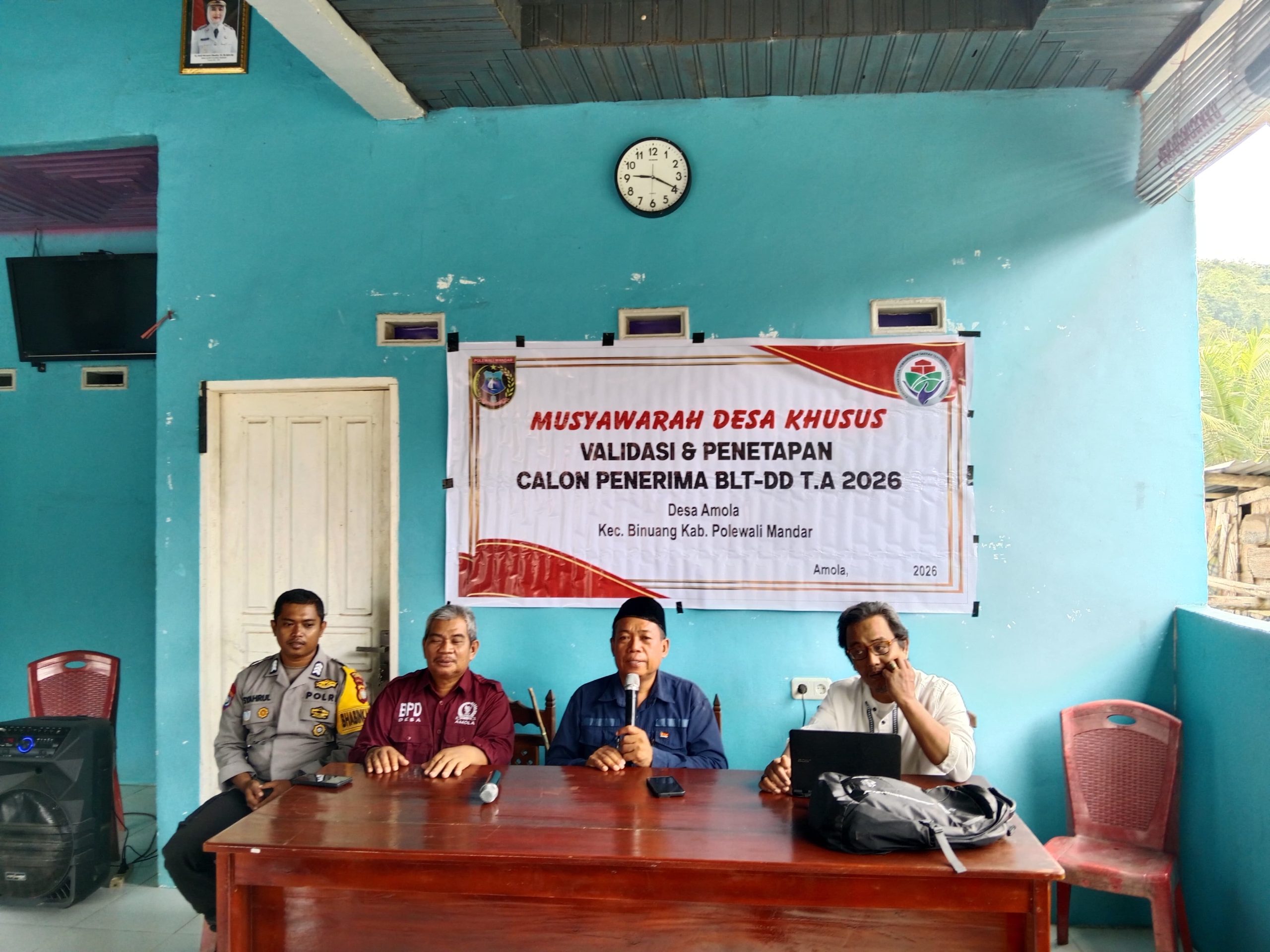 POLMAN – Komitmen mengawal penyaluran bantuan agar tepat sasaran kembali ditegaskan jajaran Polres Polewali Mandar. Bhabinkamtibmas Desa Amola Polsek Binuang turun langsung menghadiri Musyawarah Desa Khusus (Musdesus) penetapan calon penerima Bantuan Langsung Tunai (BLT) Tahun Anggaran 2026 yang digelar di Kantor Desa Amola, Kecamatan Binuang, Kabupaten Polewali Mandar, Rabu (18/2/2026).