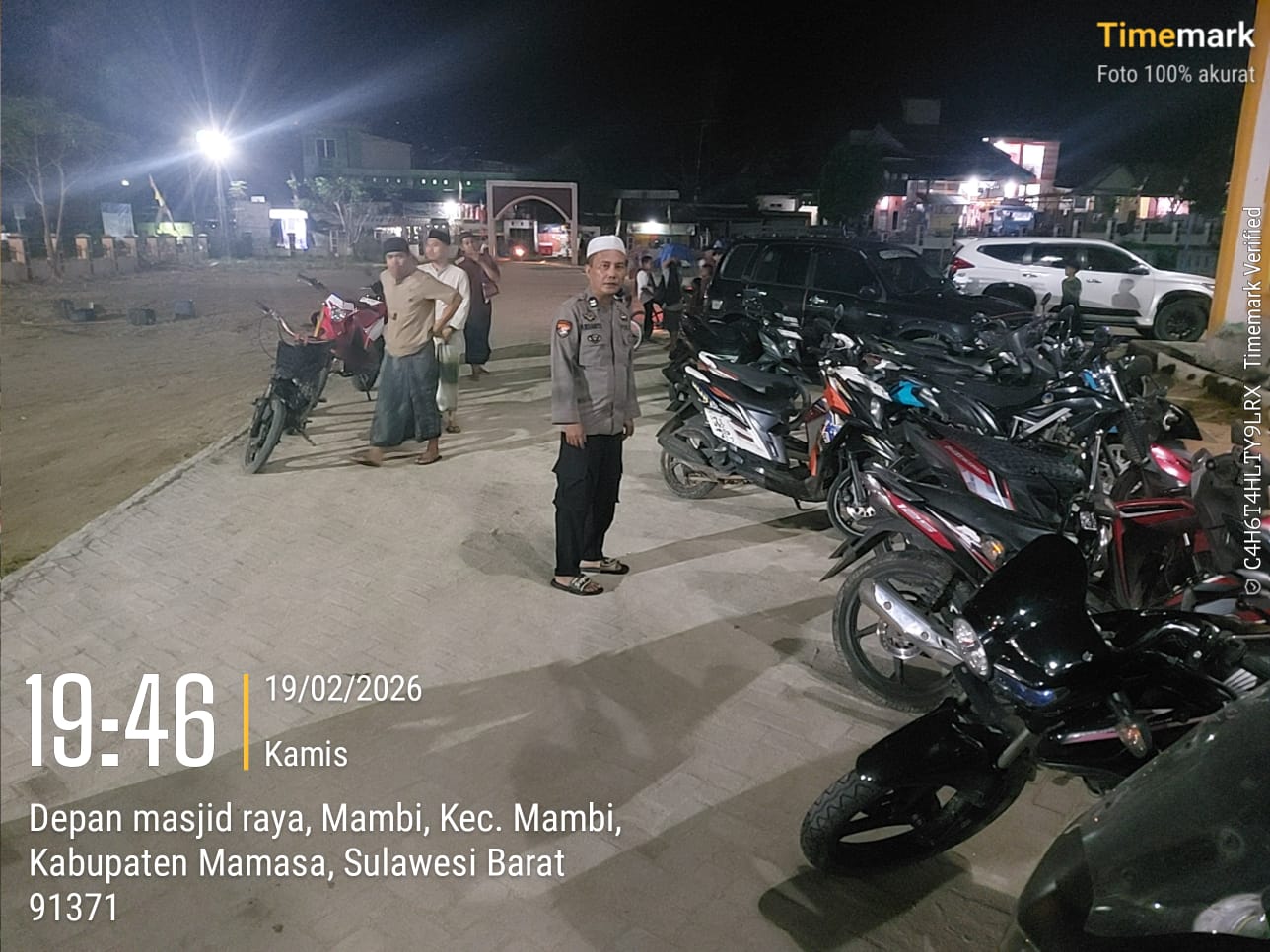 Kegiatan pengamanan berlangsung sekitar pukul 19.30 WITA di Masjid Raya Mambi, Kelurahan Mambi, Kecamatan Mambi, Kabupaten Mamasa. Pengamanan dilaksanakan oleh AIPTU Arianto S guna memastikan situasi keamanan dan ketertiban masyarakat (kamtibmas) tetap aman dan kondusif selama pelaksanaan ibadah berlangsung.