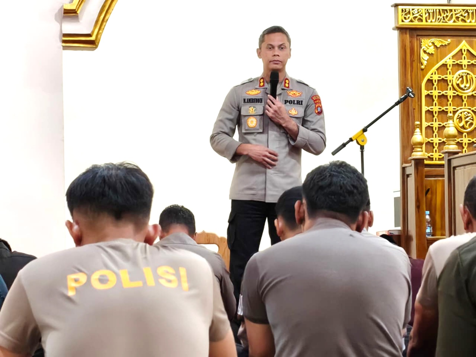 Dalam arahannya, Kapolres menekankan pentingnya memakmurkan masjid, khususnya Masjid Polres Majene, melalui pelaksanaan Shalat Dzuhur berjamaah yang dilanjutkan dengan tadarusan Al-Qur’an. Menurutnya, ibadah yang dilakukan secara konsisten dan berjamaah tidak hanya memperkuat keimanan, tetapi juga menumbuhkan kebersamaan serta keteladanan di lingkungan kerja.