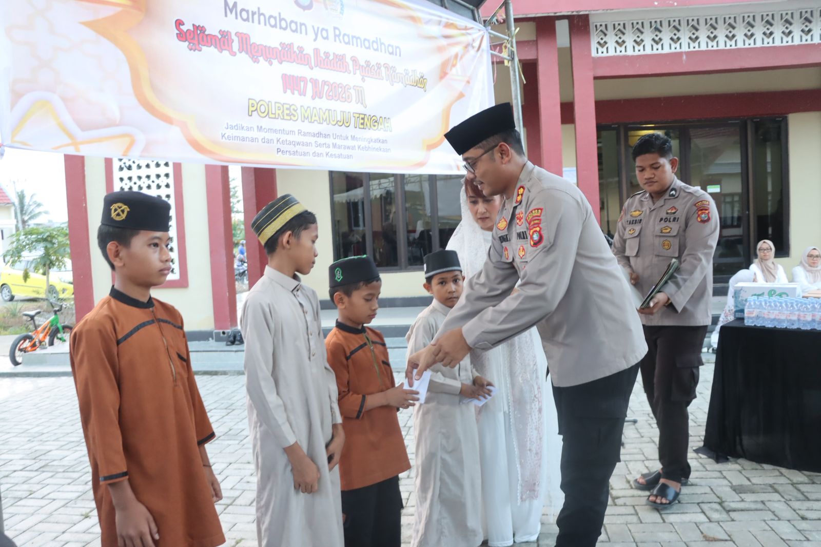 Kegiatan penuh kehangatan tersebut turut dihadiri anak-anak yatim sebagai bentuk kepedulian sosial keluarga besar Polres Mamuju Tengah di bulan yang penuh berkah. Suasana kebersamaan begitu terasa sejak awal acara yang diawali dengan tausiyah singkat, dilanjutkan doa bersama, hingga penyerahan santunan kepada anak-anak yatim sebelum waktu berbuka tiba.