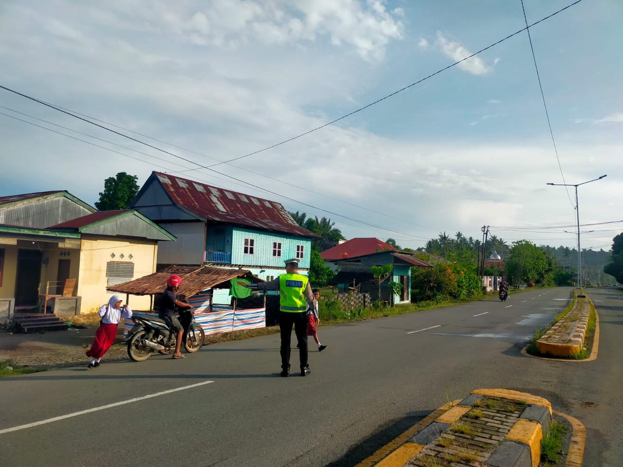 Selain melakukan pengaturan lalu lintas, personel Sat Lantas juga membantu penyeberangan pelajar serta memberikan imbauan kepada pengendara agar selalu tertib berlalu lintas dan mengutamakan keselamatan di jalan raya.