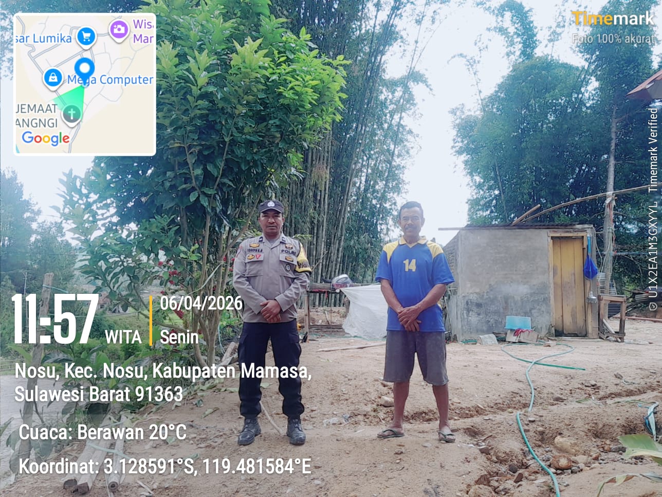 Pada Senin (6/4/2026) sekitar pukul 11.57 WITA, Bhabinkamtibmas Aipda Yoseph K.H melaksanakan kegiatan sambang dan monitoring di Lingkungan Mangngi, Kelurahan Nosu, Kecamatan Nosu, Kabupaten Mamasa.