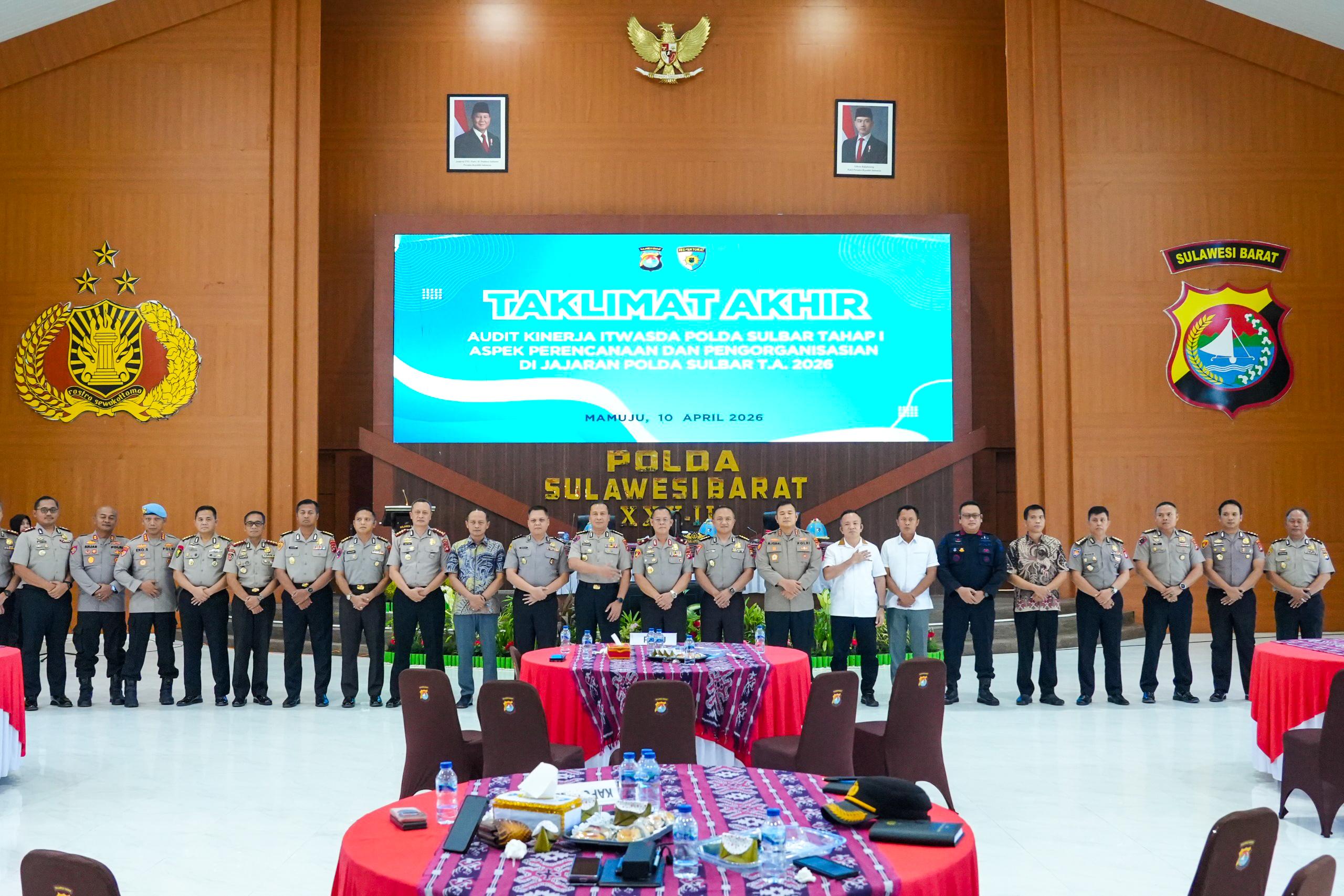 MAMUJU – Wakapolda Sulawesi Barat, Hari Santoso, secara resmi menutup kegiatan Taklimat Akhir Audit Kinerja Itwasda Polda Sulbar Tahap I Tahun Anggaran 2026, yang digelar di Aula Marannu Mapolda, Jumat (10/4/2026).