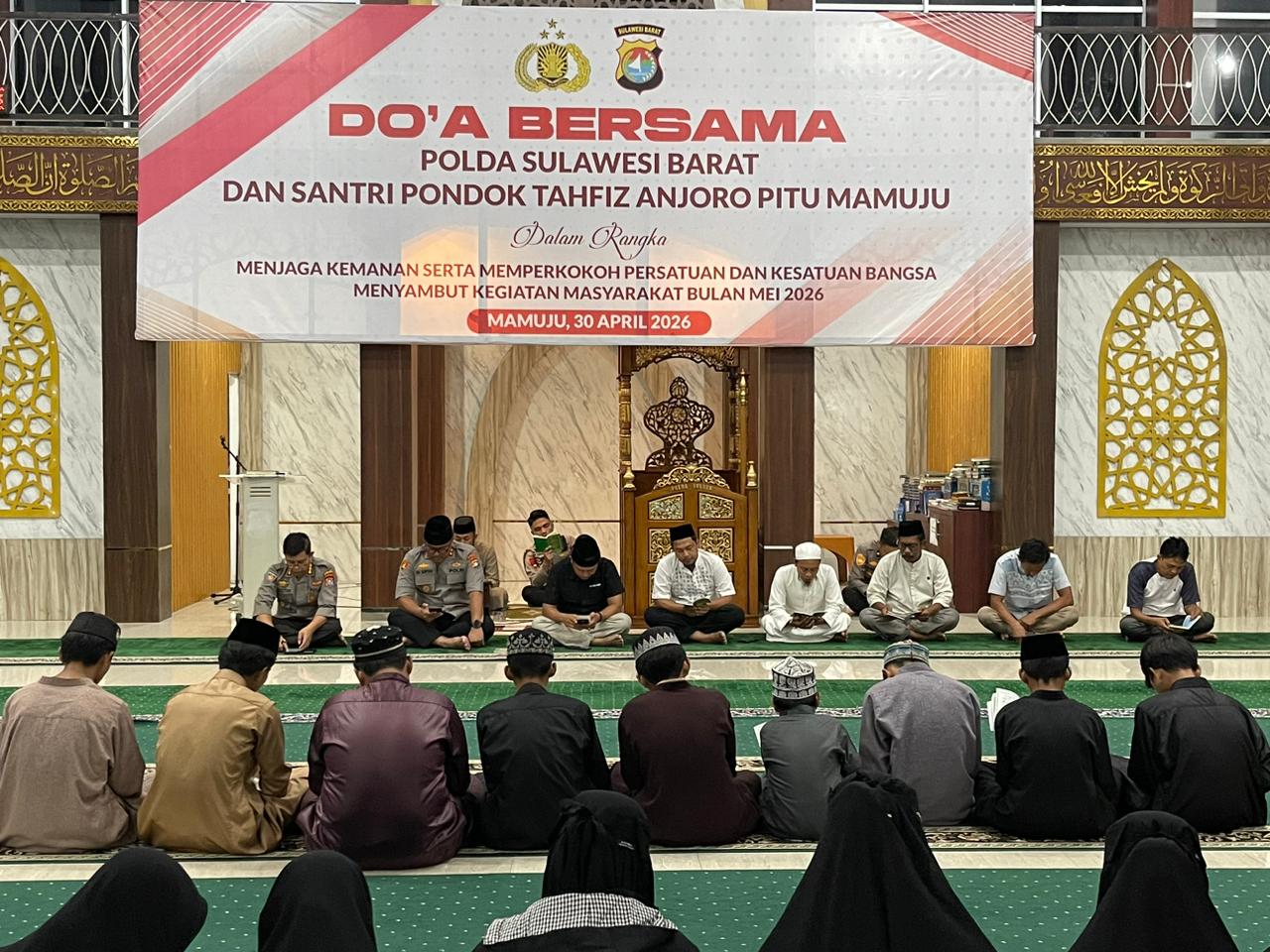 MAMUJU – Dalam upaya menjaga stabilitas keamanan sekaligus memperkokoh persatuan dan kesatuan bangsa, Kepolisian Daerah Sulawesi Barat (Polda Sulbar) menggelar doa bersama dengan melibatkan para santri tahfiz dari Anjoro Pitu Mamuju, Kamis (30/4/2026).